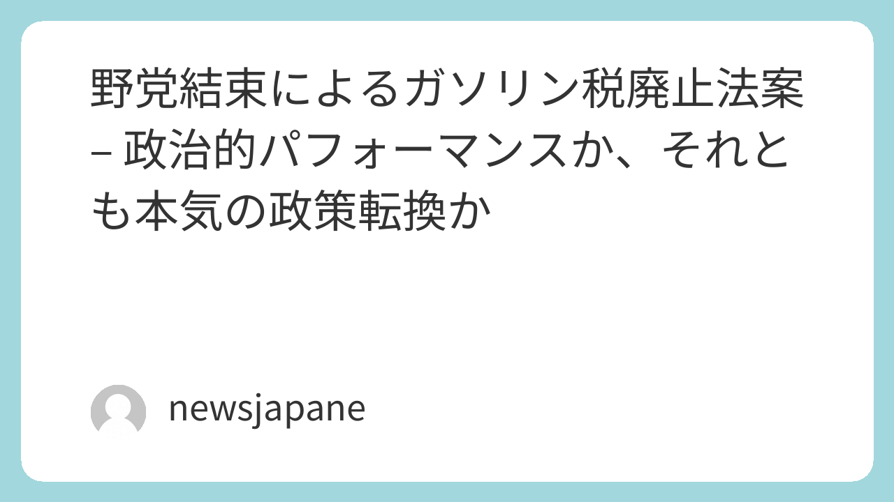 むしろ重要なのは、野党が単なる反対勢力から「責任ある政策提案者」へと変化できるかどうかです。ガソリン税廃止を含む包括的な税制改革案や、代替財源の確保策、そして実施時期やその影響について、より具体的で現実的な提案を示すことが求められるでしょう。